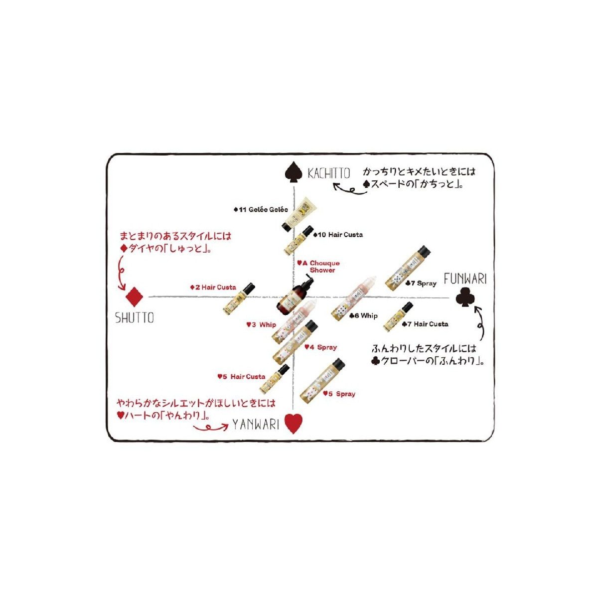 ぷるぷるの“ジュレ”のようなテクスチャーのスタイリング剤。セット成分のすべてが水溶性成分で構成された本格派ウォータージェルなので、みずみずしい束感、ぬれたようなツヤ感を簡単に表現できます。伸びが良く使いやすく、セットした後に「かちっと」決まるセット力とキープ力、ジュレジュレだけの質感を楽しんでください。