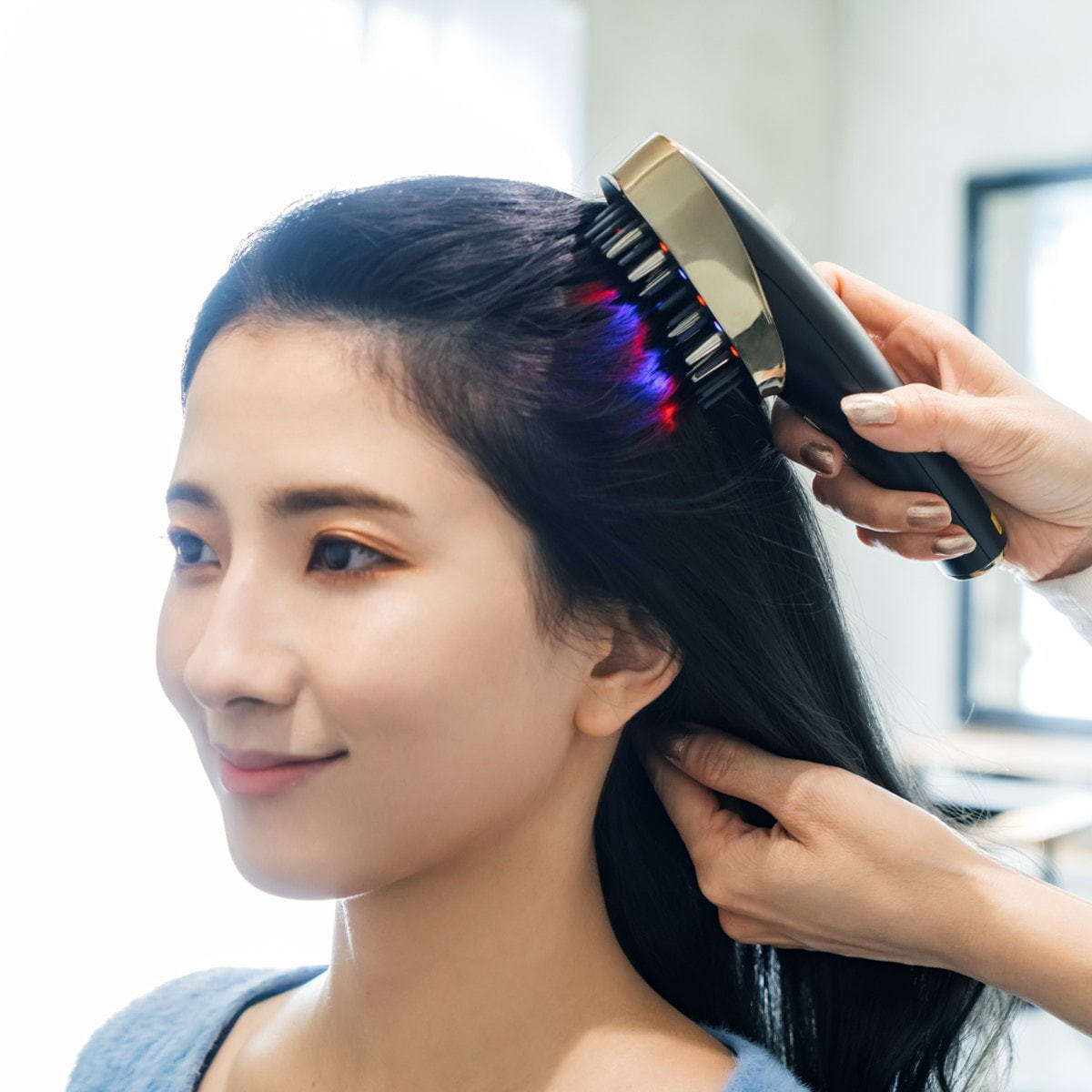 髪の生え際から頭頂部に向かって引き上げるように動かすことで、頭皮だけではなくお顔までリフトケア*します。